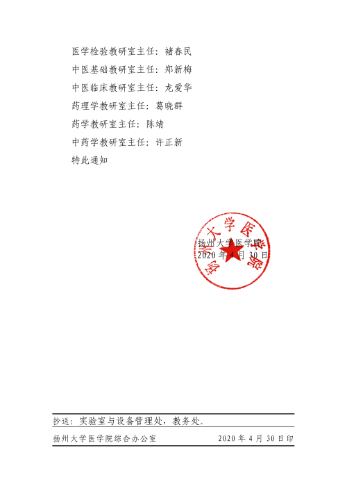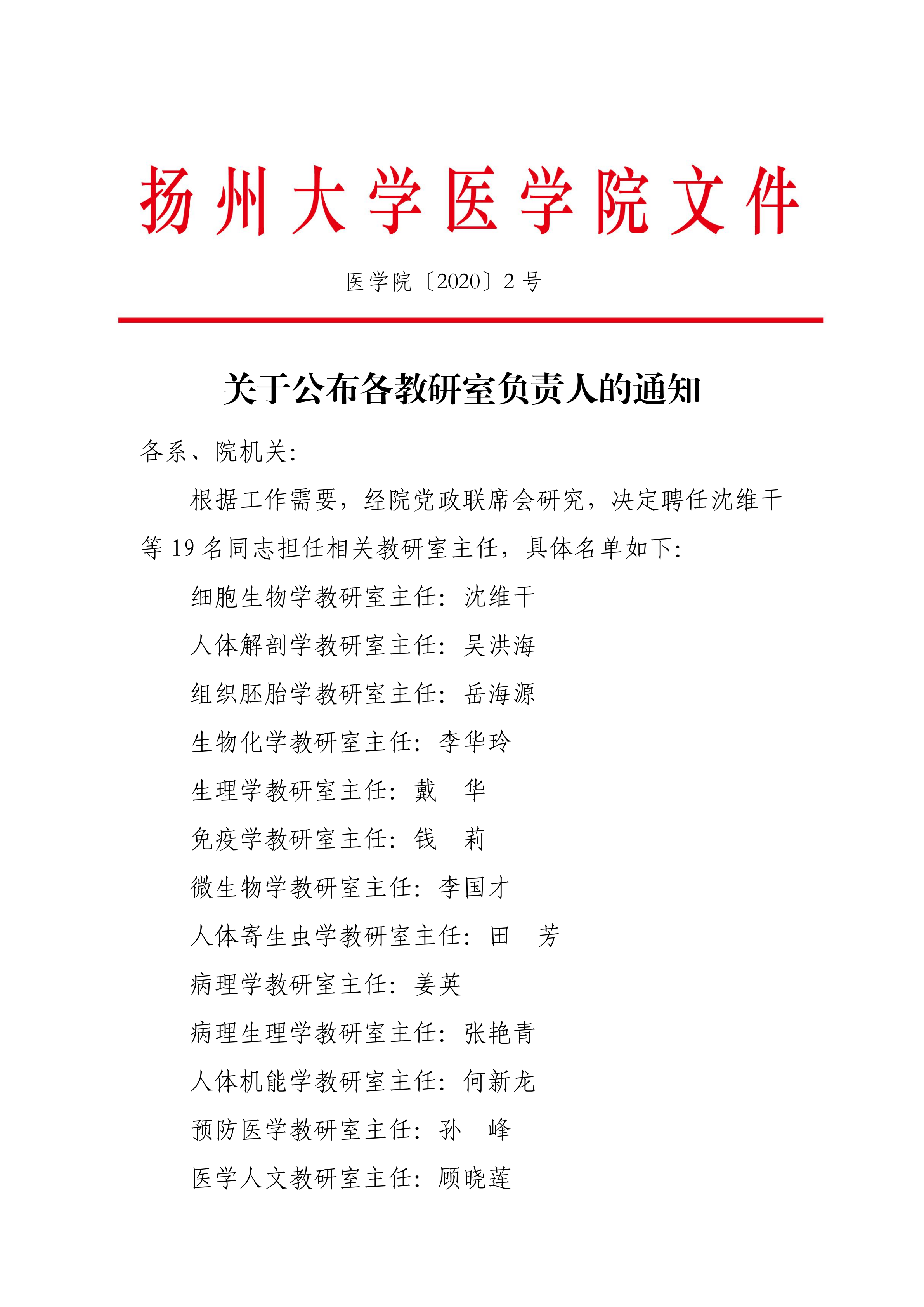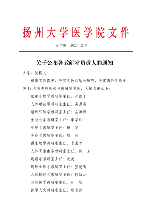 关于公布各教研室负责人的通知(医学院[2020]2号)