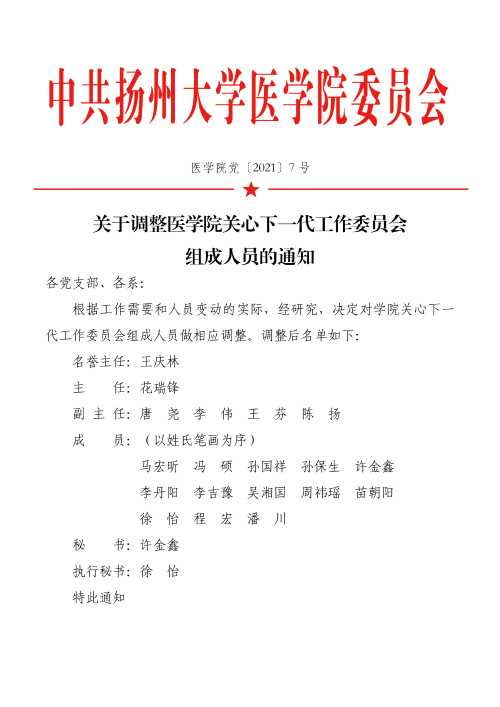 关于调整医学院关心下一代工作委员会组成人员的通知(医学院党〔2021〕7号)