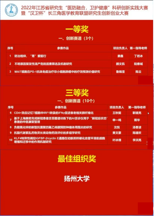 12月18日, 2022年江苏省研究生“医防融合,卫护健康”科研创新实践大赛暨“汉卫杯”长三角医学教育联盟研究生创新创业大赛在南京医科大学举行,我院姜鑫同学团队(指导老师:丁岩冰教授)获得创新赛道一等奖。叶冰倩同学团队(指导老师:李洪亮副教授)获得创新赛道三等奖。扬州大学荣获最佳组织奖。